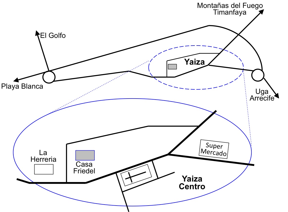 Das Casa Friedel liegt in Yaiza, dem größten Dorf im Süden der Insel, am Rande des Nationalparks Timanfaya, fernab von den lebhaften Touristenzentren. Yaiza ist Ausgangspunkt für Touren in die Montañas del Fuego und zu den anderen Sehenswürdigkeiten der Insel.